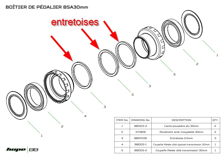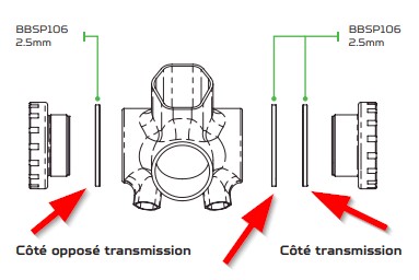 Le diamètre interne de l’entretoise doit être identique à celui (externe) de l’axe de pédalier. Son épaisseur détermine la correction que vous souhaitez apporter.