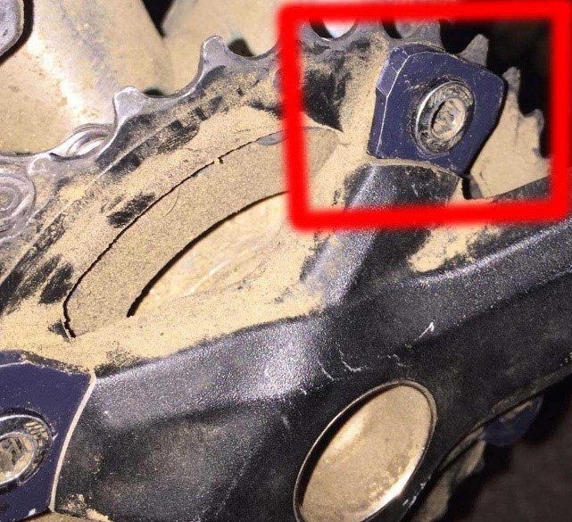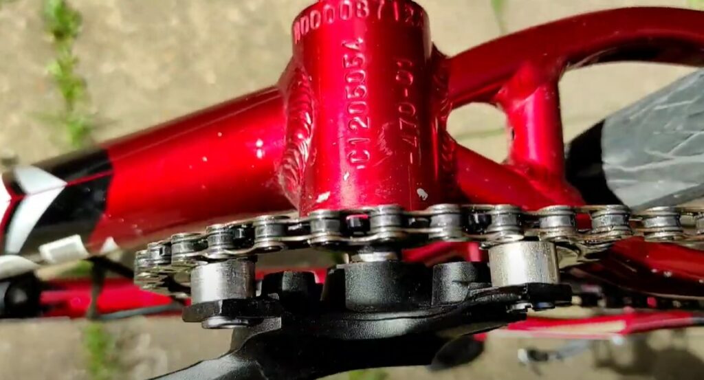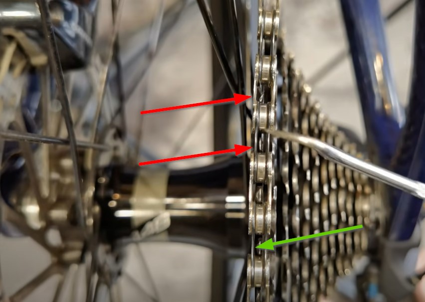 Dans cet exemple, on voit clairement que lorsque la chaîne quitte le pignon, les dents frottent sur l’intérieur gauche des maillons. Vous trouvez exactement le même problème sur le galet bas du dérailleur.