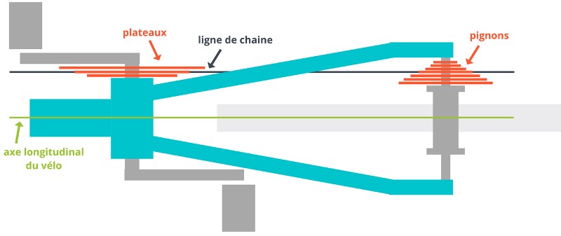 La ligne de chaîne est avant tout une notion théorique. Elle détermine la position idéale de la chaîne dans une transmission et ce, autant sur la cassette que sur les plateaux à l’avant.
