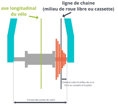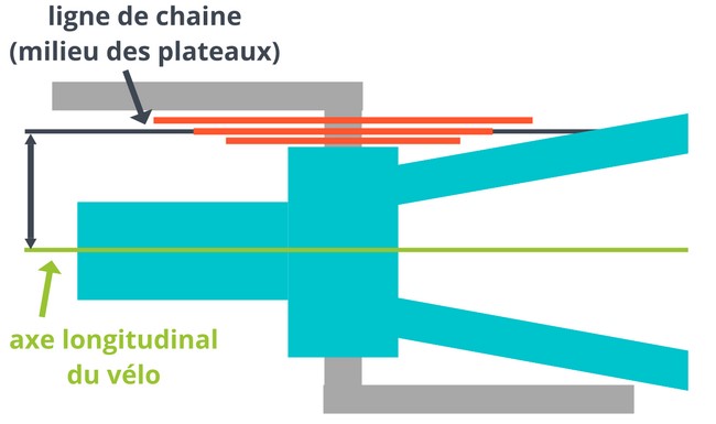 Cette ligne se mesure (en millimètres) par sa distance par rapport à l’axe du vélo. Sur la plupart des vélos, cette distance varie entre 47.5 et 50 mm. Sur les VTT récents, cela peut même atteindre 57 mm.